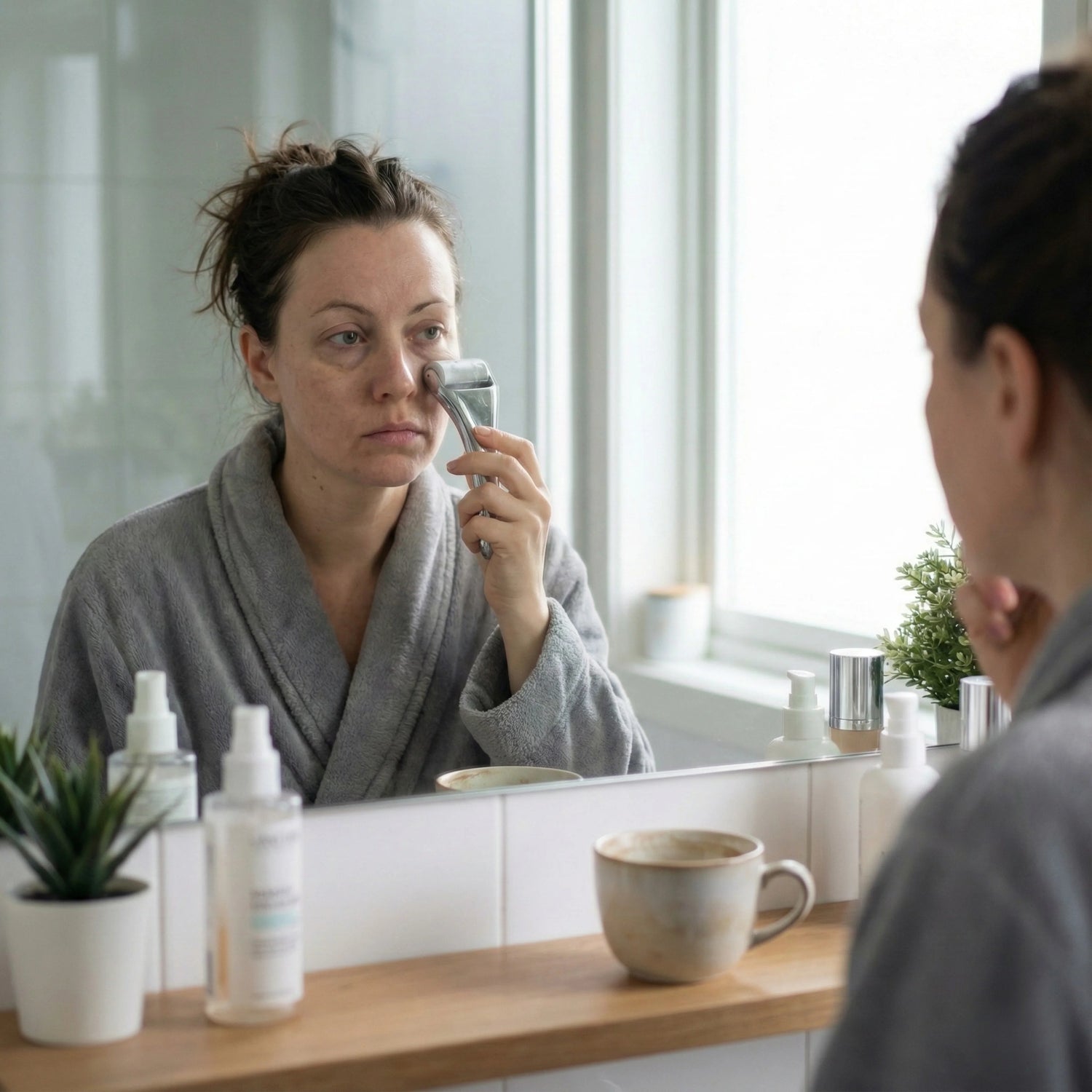 Skin looks smoother and more hydrated. Shadows lighten, makeup stops creasing, and tech-neck + Il's look less deep.